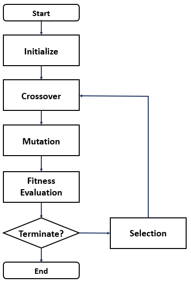 유전 알고리즘은 크게 Initialize, Fitness Evaluation, Crossover, Mutation, Selection, Terminate으로 구성됩니다. 각 요소는 문제, 염색체의 형태 등에 따라 연산 방법은 변할 수 있지만, 기본적인 역할은 변하지 않습니다. 따라서, 유전 알고리즘을 이해하고 문제에 적용하기 위해서는 각 요소의 역할 파악이 선행되어야 합니다.