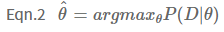 여기서 한 가지 짚고 넘어갈 점은 엔지니어는 압정의 도박 결과(=데이터 D)가 이항 분포를 따른다는 가정을 하고 있습니다. H와 T의 이항 분포로 표현하였지만 사실은 이항 분포 보다도 압정의 결과를 더 잘 규명해 줄 수 있는 분포가 분명 존재할 가능성이 있습니다! 그렇기에 데이터를 규명하기에 앞서 분기점이 발생하게 됩니다. 첫 번째는 압정의 데이터를 가장 잘 반영할 수 있는 분포를 직접 찾아내는 것이고, 두 번째는 이항 분포를 따른다는 가정에 힘을 실어주기 위해 가장 최적의 $\theta$를 찾아내는 방법입니다. 첫 번째는 논외로 하고, 두 번째 방법에 포커스를 맞춰보겠습니다. 이항 분포에서 데이터 D가 나올 가능성이 가장 높은 $\theta$를 찾는 것입니다. 이렇게 $\theta$를 찾는 방법을 최대 우도 추정(Maximum Likelihood Estimation)이라고 하며 식은 Eqn.2 와 같습니다.