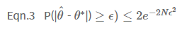 새로운 $\theta^*$을 정의하겠습니다. $\theta^*$는 아무런 에러가 없는, 즉 압정을 던져서 앞면이 나올 정확한 확률 값입니다. 그렇다면 MLE로 추론한 $\hat{\theta}$와 참인 파리미터 $\theta^*$의 차이가 특정 오차 범위(Error bound $\epsilon$)보다 클 확률을 규명하는 호프딩의 부등식(Hoeffding's Inequality)을 적용해 볼 수 있습니다.