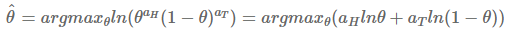 여기서 구한 $\theta$ 식을 보면 느낌이 바로 오지 않나요? $a_{H}$와 $a_{T}$에 값을 대입해 본다면 압정의 앞면이 나올 확률이 $\frac{3}{5}$가 됨을 MLE를 통해 증명하였습니다! 하지만 여기서 멈출 수는 없습니다.